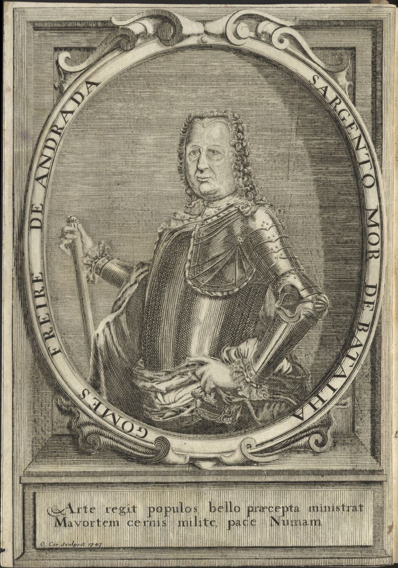 Retrato de Gomes Freire de Andrade, Conde de Bobadela em uma oval inscrita num retângulo, sobre um pedestal vê-se o retratado em meio corpo voltado três quartos para a esquerda, vestindo armadura, ostentando grande cabeleira e segurando com a mão direita o bastão do mando. Na moldura a legenda identificativa "Gomes Freire de Andrada Sargento Mor de Batalha"
