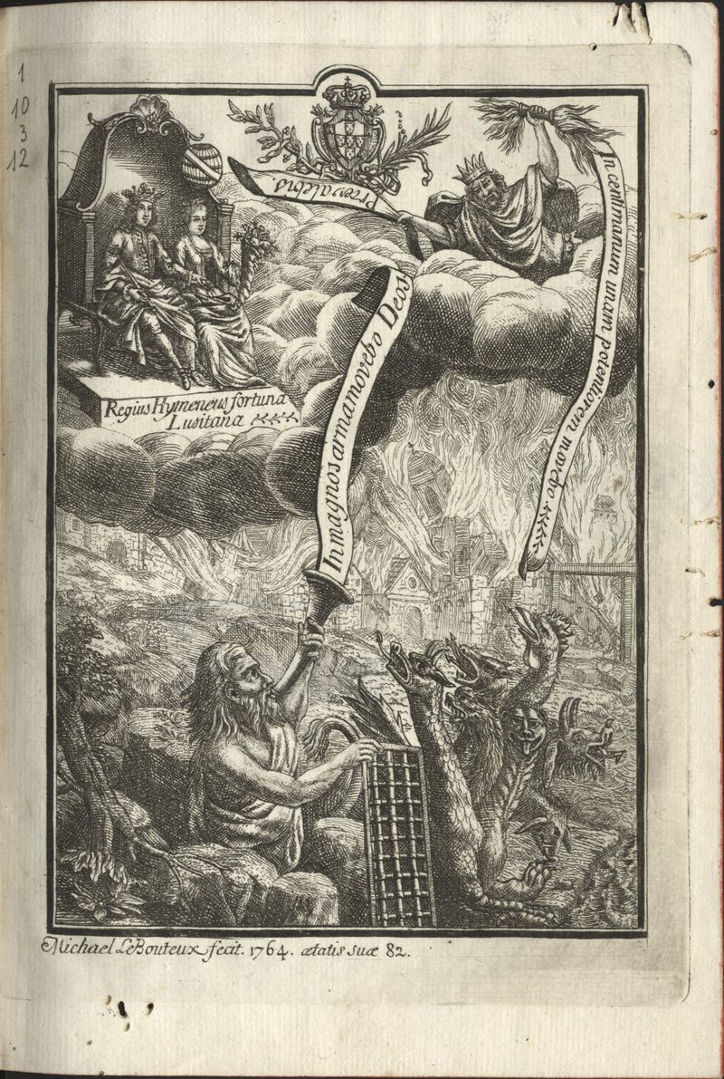 Gravura aberta a buril e água-forte alusiva ao casamento de D. Pedro e D. Maria, que se veem no alto à esquerda, sentados no trono, em cujo degrau se lê "Regius Hyneneus fortuna Lusitana". Ao meio da composição, em plano afastado, um incêndio consome a cidade e no embasamento figuras de animais e dragões alados, uma figura masculina toca a trompeta de onde saí uma longa filactera com inscrição latina.