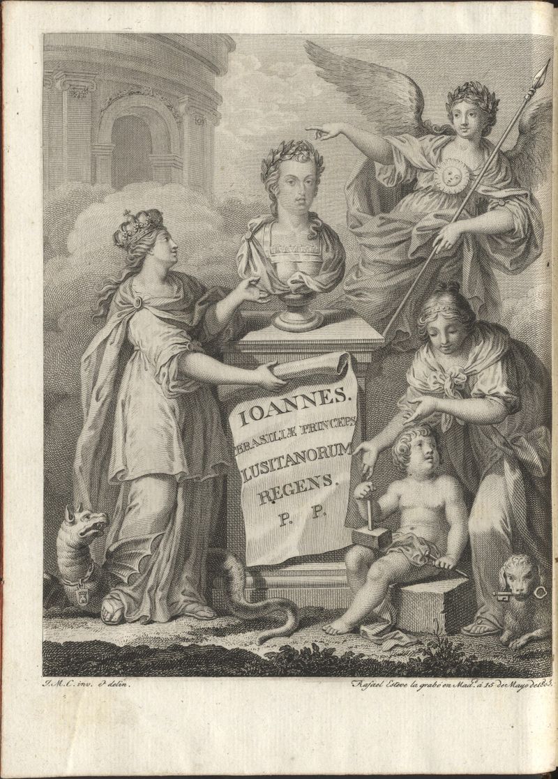 Gravura alegórica a partir do desenho de Joaquim Machado de Castro, quem também desenhou a matriz de cobre, gravada em Madrid por Rafael Esteve. Representa o Principe Regente D. João (1816-1826) num busto sobre peanha, coroado de louros, tendo à sua direita a figura da Lusitânia e do mesmo lado por entre nuvens o Templo da Memória. À esquerda a Virtude Universal está acompanhada da Fidelidade e do Génio da Escultura. Num painel que uma das figuras ostenta a legenda 2Ioannes Brasiliae Princeps Lusitanorum Regens. P.P.3, a cena passa-se no começo da subida do Monte da Glória, subscrita 2J. M. C. inv. et delin.3 [et] 2Rafael Esteve la grabó en Mad.d à 15 de Mayo de 18053