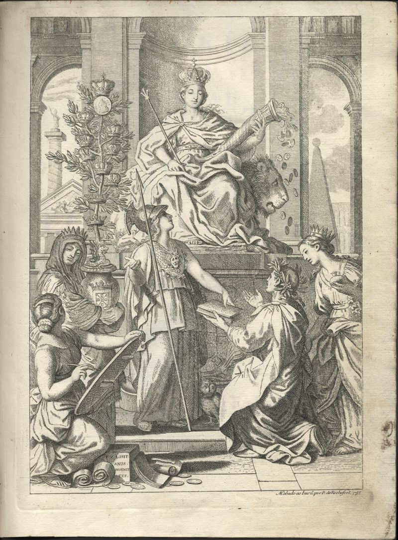 Gravura alegórica representa a Academia de História fundada por D. João V: sobre alto plinto, a figura da Realeza de cetro, coroa e cornucópia, sentada sobre um leão, recebe da mão de Minerva a obra que a Poesia ajoelhada, lhe entrega. À esquerda a História escreve os feitos dos reis que se veem representados numa árvore genealógica pelas coroas reais e superior a todos, D. João V, figurando em busto, num medalhão.