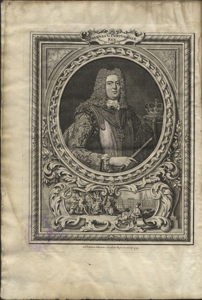 Retrato de D. João V (1689-1750) delineado e aberto por Guilherme Francisco Lourenço Debrie. Moldura retangular, tem no topo, ao centro, uma cartela com a legenda identificativa do monarca 2Joannes V. Portugalliae Rex3, este surge dentro de uma oval, representado a meio corpo, virado para a direita com roupagem riquíssima de rico brocado. Usa a cabeleira que nos habituámos a ver na sua efígie e colar com fita e cruz ornada com pedrarias. Na mão direita, o bastão e, ao fundo do espaço cénico compositivo, sobre uma mesa, a coroa aparece pousada em almofada de veludo. Em baixo, sob a oval, uma representação alegórica com Tritão e figuras marinhas tem por fundo a vista do Paço da Ribeira numa alegoria à navegação, ao comércio e à riqueza do reino. Em primeiro plano, à direita, a alegoria à Fortuna identificada pela sua cornucópia. Ainda na parte alegórica da peanha a figura alusiva à fundação da Academia Real da História Portuguesa e ao fundo uma vista do Convento e Palácio de Mafra, subscrita 2G.F.L. Debrie deliniator et sculptor Regis inv[enit] et sculp. 17433