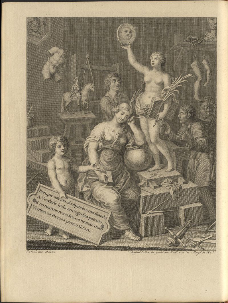 Alegoria à Estátua de D. José I, representando a Escultura executando a estátua da Verdade; os cegos da lenda aproximando-se da peanha sobre que ela se encontra, vão-na tateando. Ao lado da Escultura está o seu Génio com uma tabula em que se lê o elogio desta Arte 2Sempre attenta esculpindo, e meditando, /A verdade inda ao Cego faz patente, / E no mármore, cedro, ou bronze duro/ vivifica os Heroes para o futuro3, ao fundo o modelo da estátua equestre; a cena passa-se no ateliê do escultor Joaquim Machado de Castro, tem a subscrição 2J. M. C. inv. et delin.3 [e] 2Rafael Esteve la grabó en Mad.d à 15 de Mayo de 18053 .