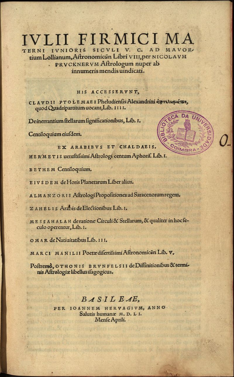 Dados do colofon: "Basileae : ex officina Joannis Hervagii, Anno Salutis humanae 1551, Mense Aprili".