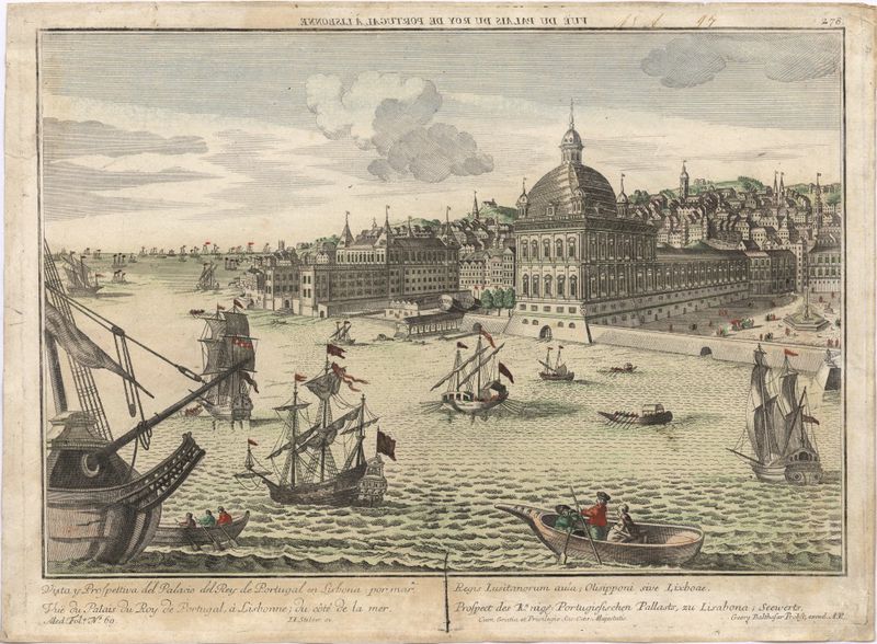 Vista y Prospettiva del Palacio del Rey de Portugal en Lisvona: por mar = Vüe du Palais du Roy de Portugal, à Lisbone; du côté de la mer = Regis Lusitanorum aula; Olisipponi sive Lixboae = Prospect des Konigl: Portugiesischen Pallasts, zu Lisabona; Seewerts