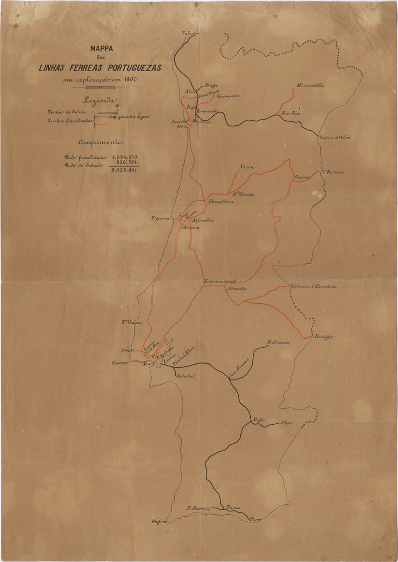 Mapa das linhas férreas portuguesas em exploração em 1900
