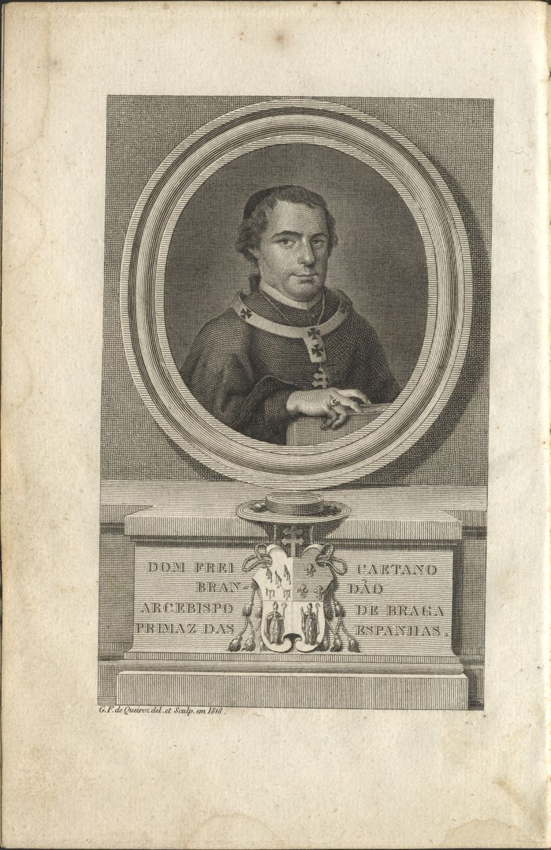 Retrato do Frei Caetano Brandão, Arcebispo de Braga, em uma moldura oval sobre fundo retangular ao alto e assente sobre peanha, está o retratado em busto, voltado para a direita, olhando para a frente e tendo a sua mão direita colocada em cima de um livro. Na peanha abre-se o brasão do retratado timbrado por chapéu eclesiástico e dividindo a inscrição "Dom Frei Caetano Brandão Arcebispo de Braga Primaz das Espanhas"