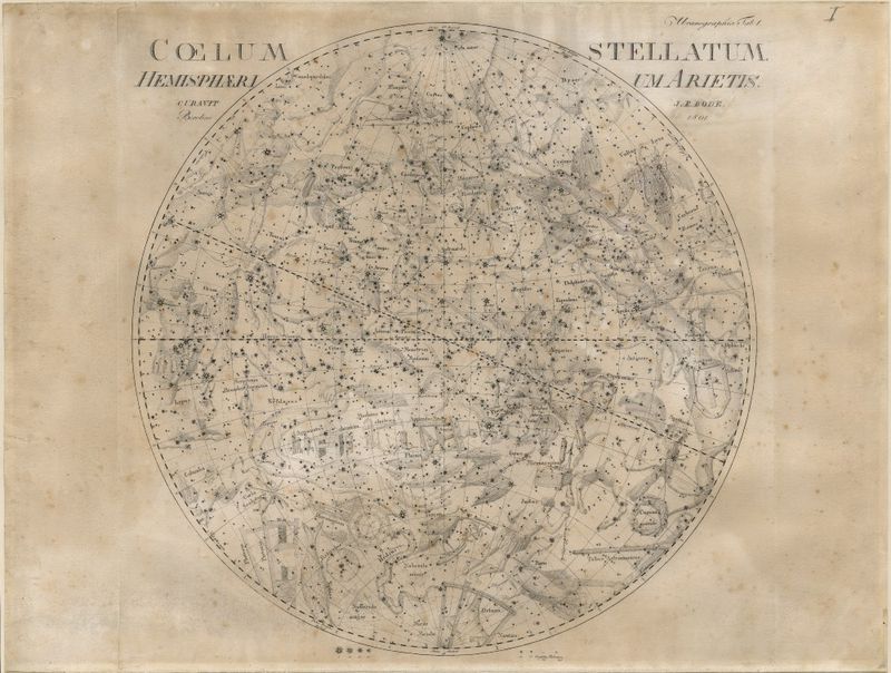 Carta celeste com projecção esférica do 1º ponto vernal identificada em: BODE, Johann Elert - Uranographia sive astrorum descriptio. Berolini, 1801.