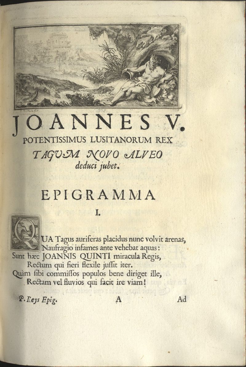 Reis, António dos. Joanni V Epigrammatum libri quinque. Ulyssipone Occidentali : ex praelo Josephi Antonii A'Sylva, 1728. Vol. 1, (1728), f. 49.