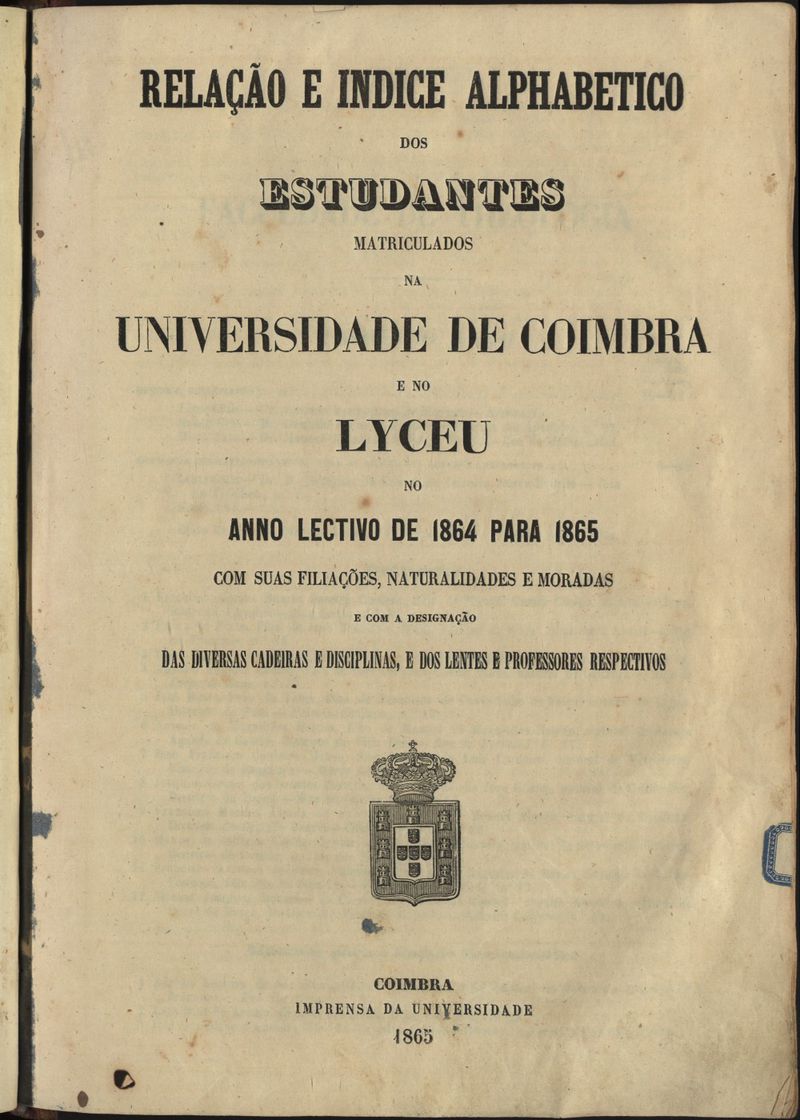 Relação e índice alfabético dos estudantes matriculados na Universidade de Coimbra e no Liceu