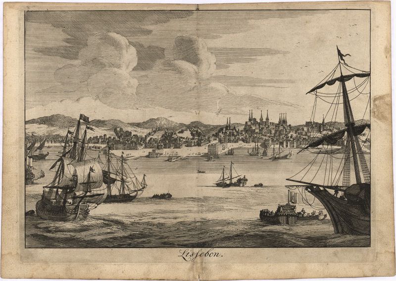 Gravura de Lisboa vista do rio, apresenta embarcações da época.