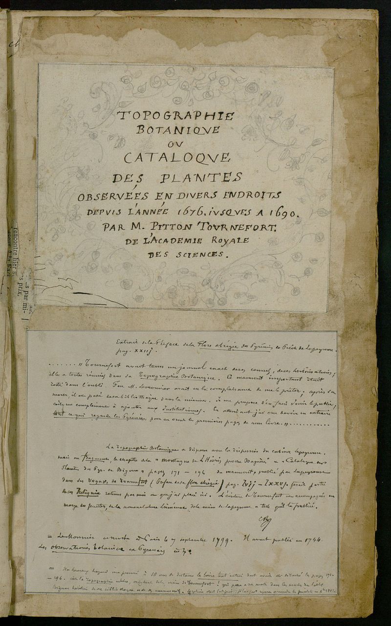 No verso do recorte colado na página de título, pode ler-se: "Lusitania observavit / Catalogue de provence / Des alpes / Des pyrenC)es / De Espagne / De Portugal". - Várias notas ms. - A seguir C s guardas, em fol. capeando separata de Botanisches Centralblatt, 17 (1882) sobre o manuscrito de Pitton de Tournefort, nota ms. ass. por Júlio Henriques : " Foi-me offerecido este manuscripto para a bibliotheca do jardim botanico da Universidade de Coimbra pelo Snr. Casimiro RoumeguC(re, redactor da Revue Mycologique, em 15 de dezembro de 1882. [Ass.] Julio A. Henriques".