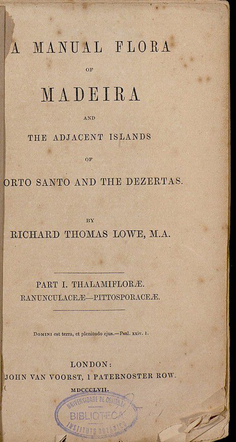 A manual flora of Madeira and the adjacent islands of Porto Santo and the Dezertas. Part I. Thalamiflorae, ranunculaceae, pittosporaceae / by Richard Thomas Lowe