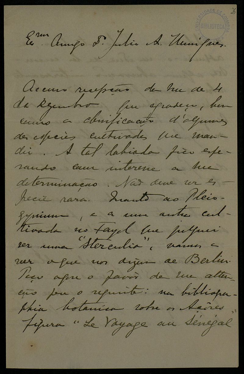 [Carta, 1906?, Ponta Delgada], a Dr. Júlio A. Henriques, [Coimbra]