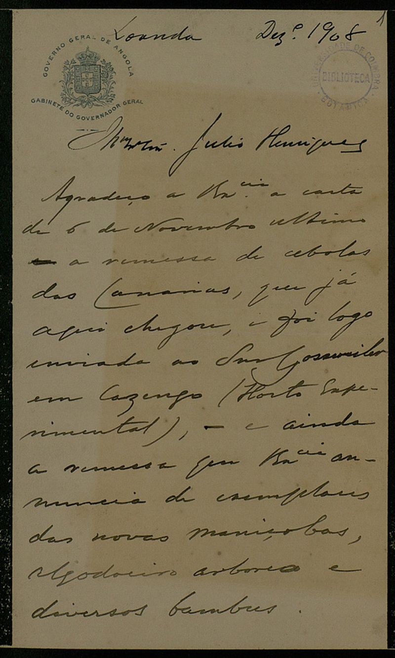 [Carta], 1908 Dez., Loanda, a Júlio Henriques, Coimbra