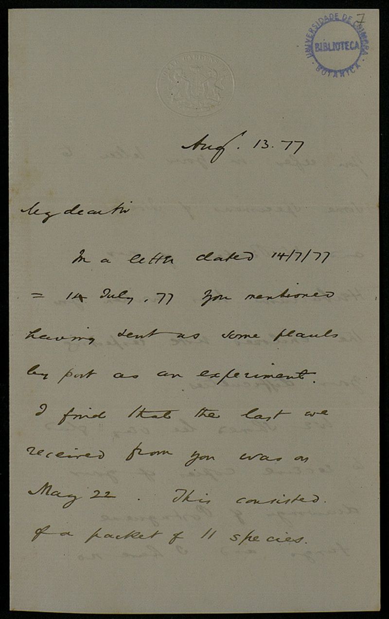 [Letter], 1877 Aug. 13, [Kew, to] Sir [Júlio Henriques, Coimbra]