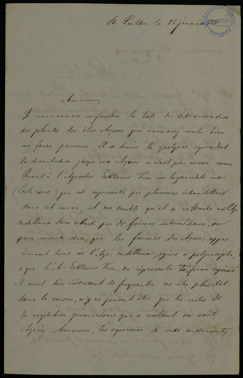 [Lettre], 1882 jan. 15, St. Poelten, [à] Monsieur [Júlio Henriques], Coimbra