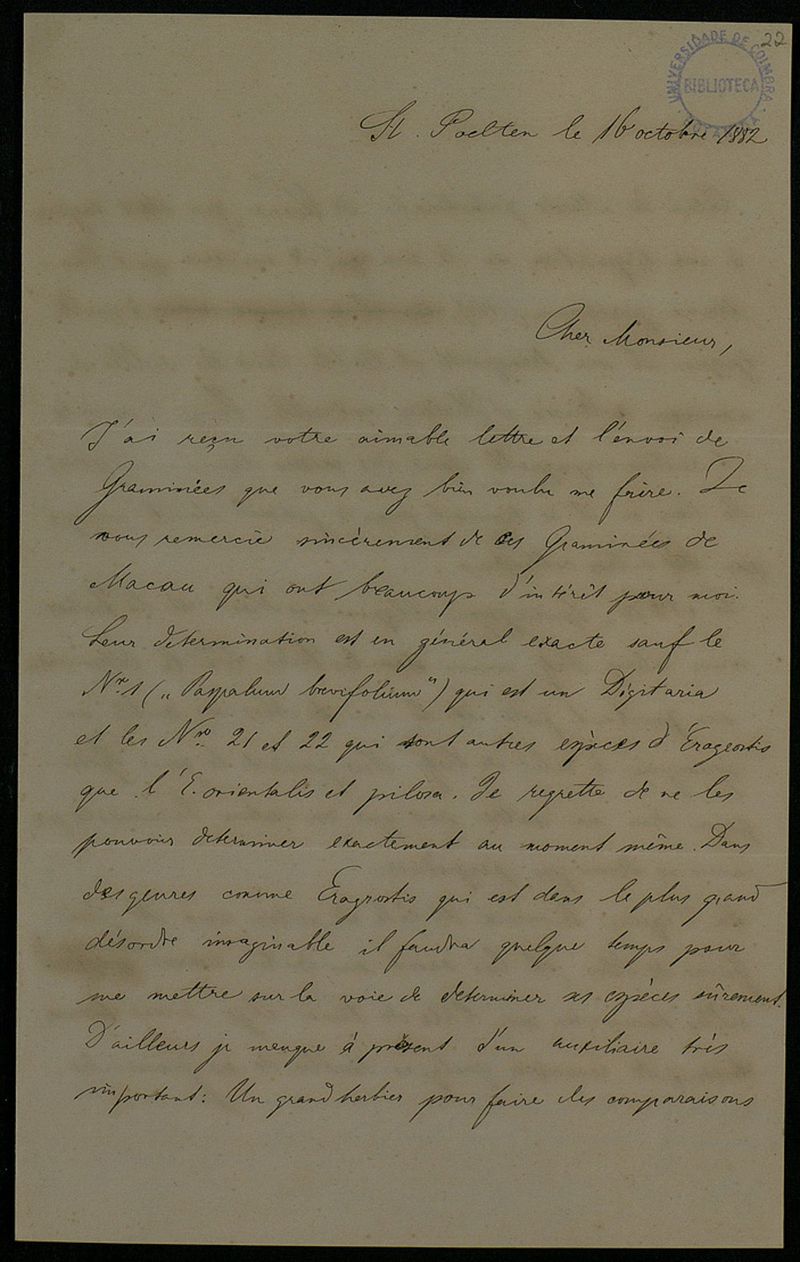 [Lettre], 1882 oct. 16, St. Poelten, [à] Monsieur [Júlio Henriques], Coimbra