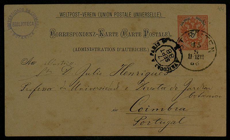 Correspondenz-Karte, 1888 sept. 15, St. Poelten, [à] D. Julio Henriques, Coimbra