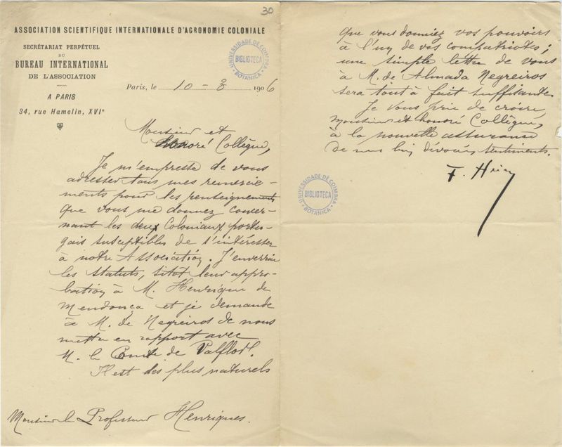 [Lettre], 1906 août 10, Paris, [à Júlio] Henriques, [Coimbra]