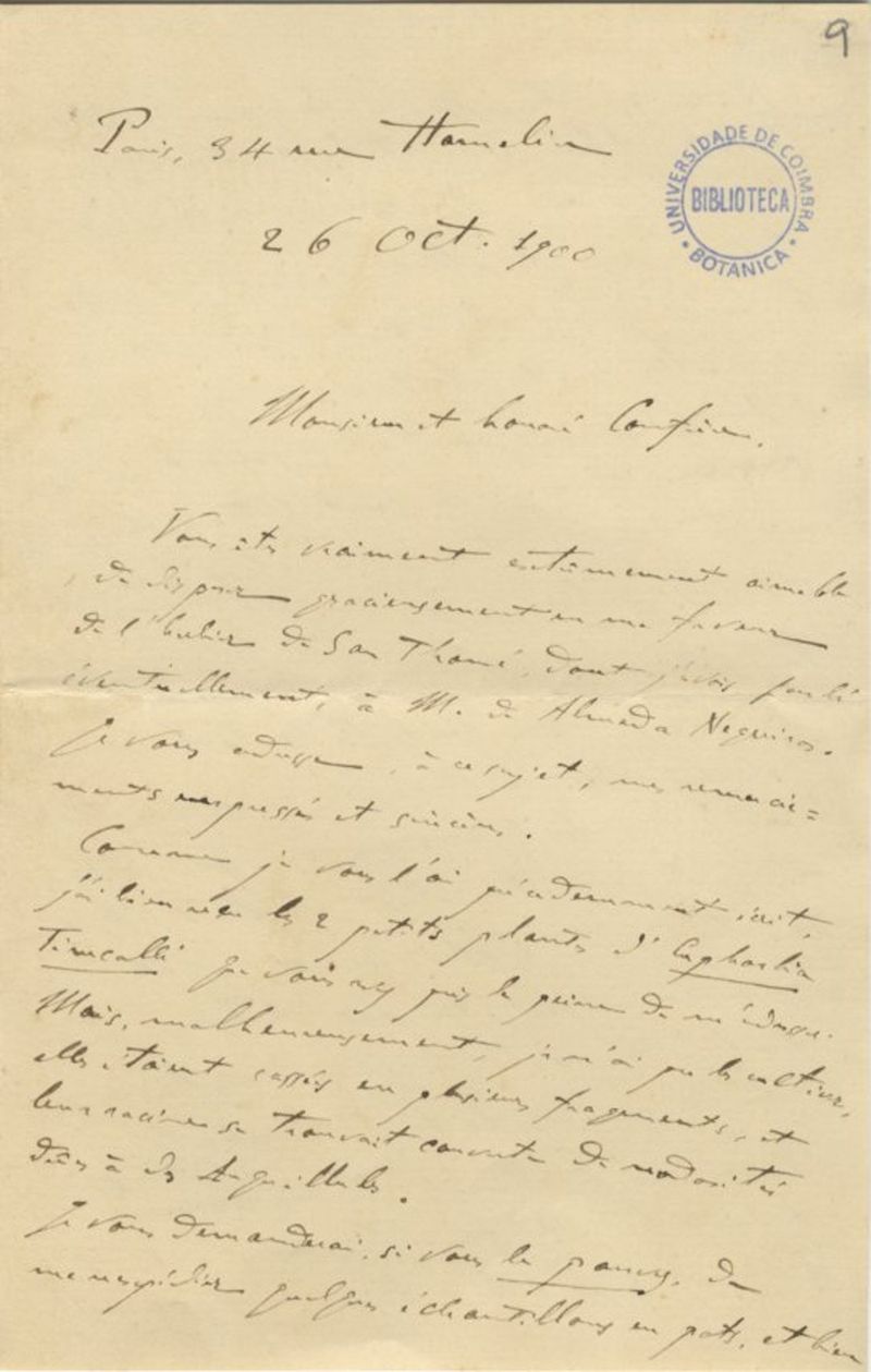 [Lettre], 1900 oct. 26, Paris, [à Júlio Henriques, Coimbra]