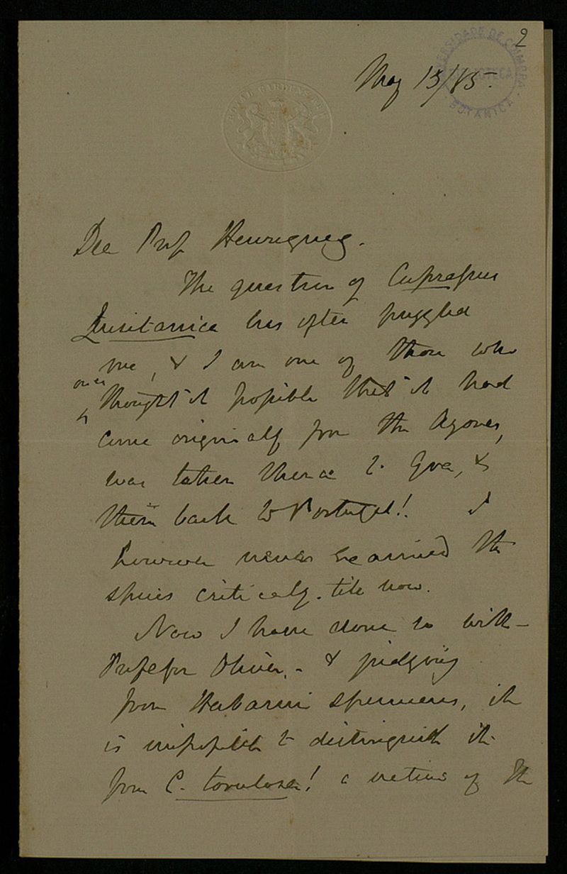 [Letter], 1885 May 13, Kew, [to ] Prof. [Júlio] Henriques, Coimbra