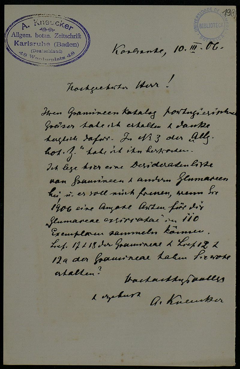 [Brief], 1906 März 10, Karlsruhe, [an] Herr[n Júlio Henriques, Coimbra]