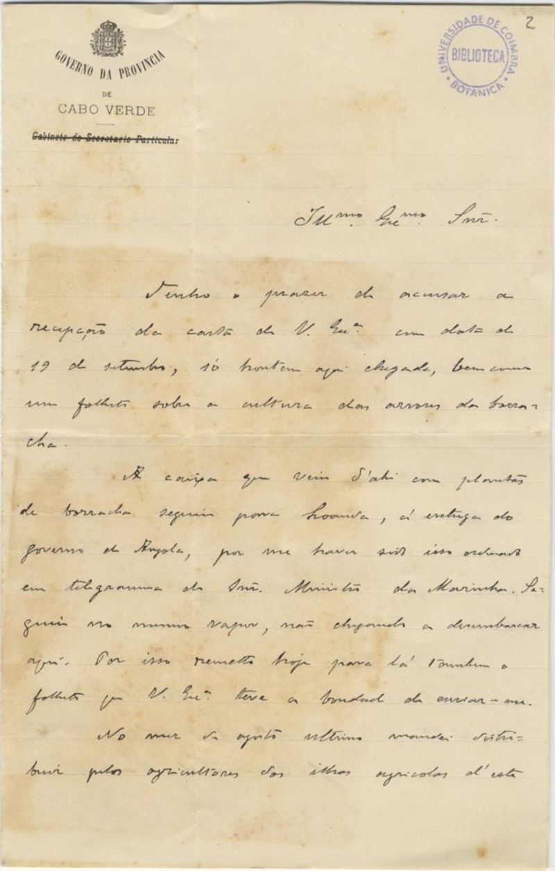 [Carta], 1899 Out. 14, Cidade da Praia, [a Júlio Henriques, Coimbra] J. Cesario de Lacerda