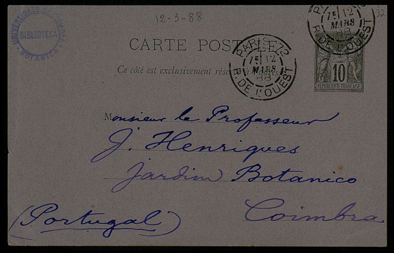 Carte postale, 1888 mars 12, Paris, [à] Monsieur le Professeur J. Henriques, Coimbra