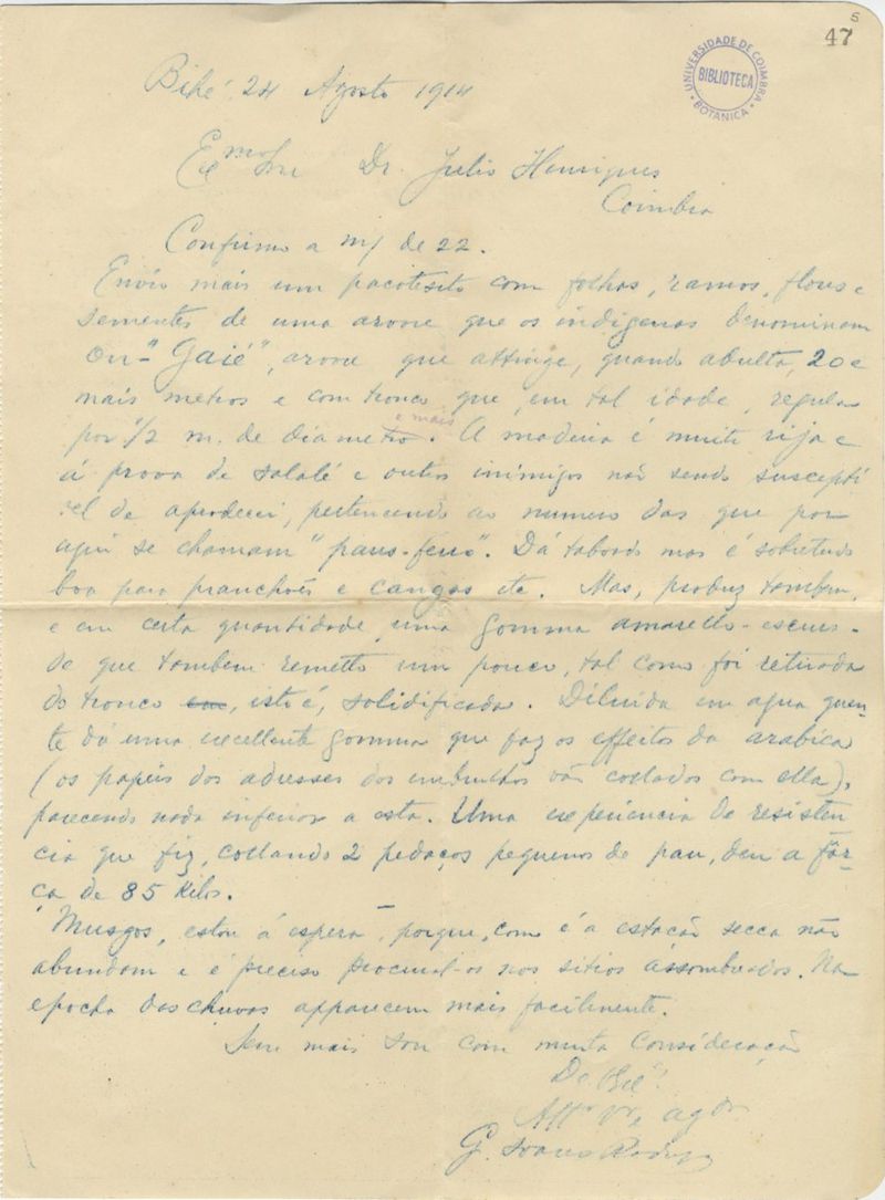 [Carta], 1914 Ago. 24, Bihé, [a] Julio Henriques, Coimbra G. Soares Henriques