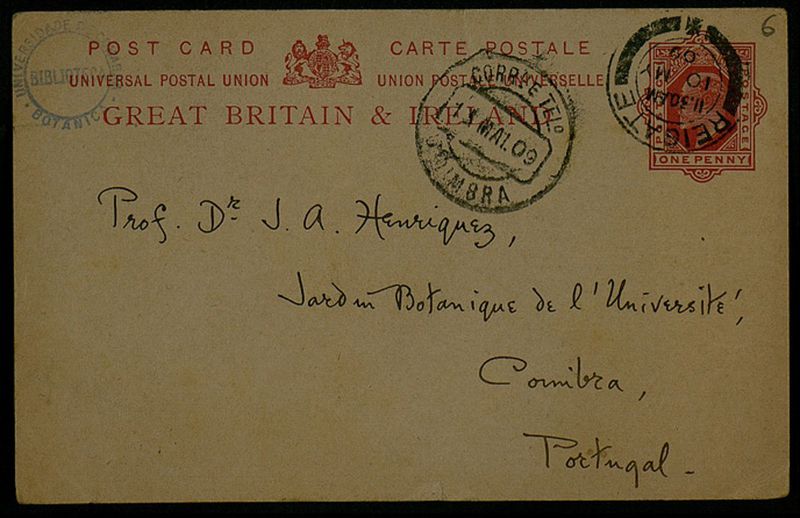 Post Card, 1909 May 10, Reigate, [to] Prof. Dr. J. A. Henriquez, Coimbra
