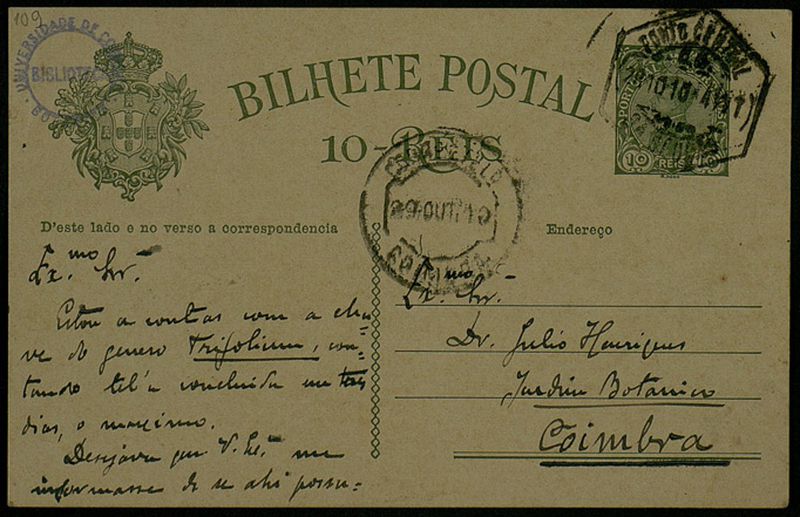 Bilhete Postal, 1910 Out. 28, Porto, a Dr. Júlio Henriques, Coimbra