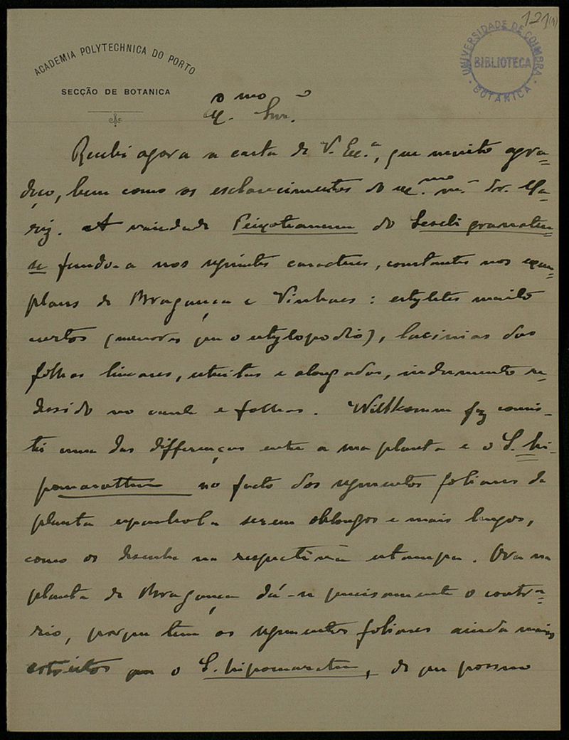 Papel timbrado de: Academia Polythechnica do Porto - Secção de Botanica.
