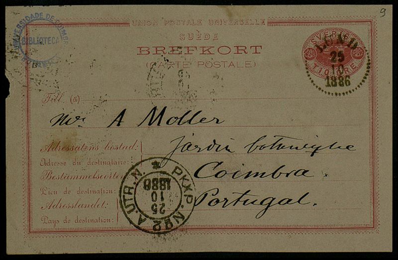 Brefkort, 1886 Okt. 25, Lund, till Mr. A. Moller, Coimbra
