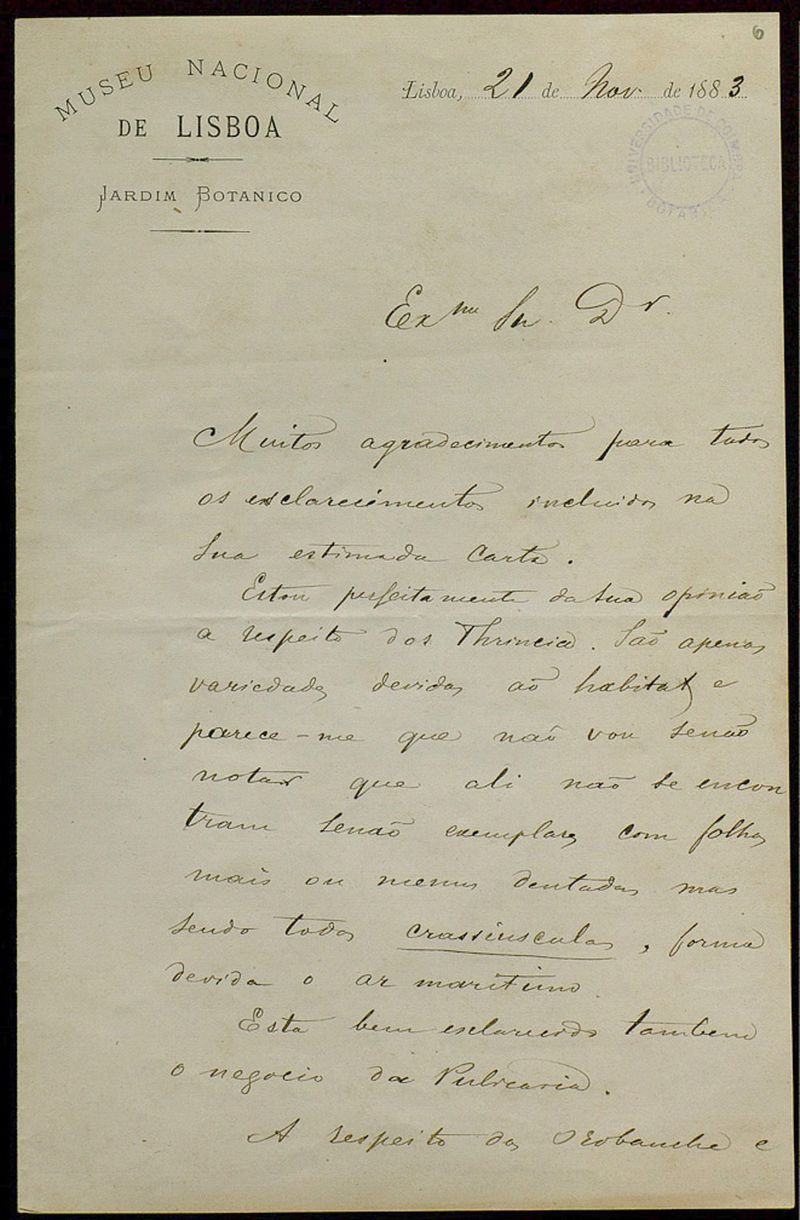 [Carta], 1883 Nov. 21, Lisboa, [a Joaquim Mariz, Coimbra]