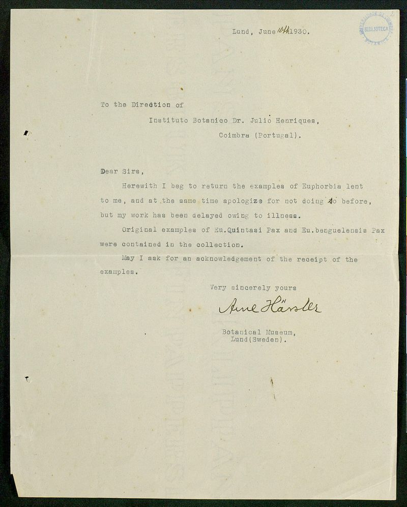 [Letter], 1930 June 10, Lund, [to Luis Carrisso], Coimbra