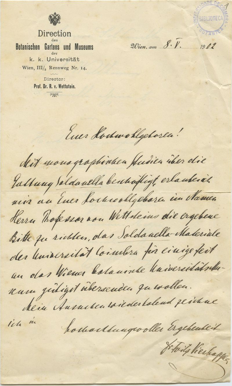 [Brief], 1902 Mai 8, Wien, [an Júlio Henriques, Coimbra]