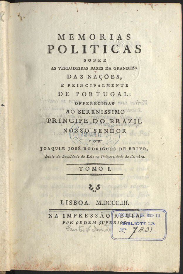 Memorias politicas sobre as verdadeiras bases da grandeza das Nações e principalmente de Portugal oferecidas ao Serenissimo Príncipe do Brazil... / por Joaquim José Rodrigues de Brito.