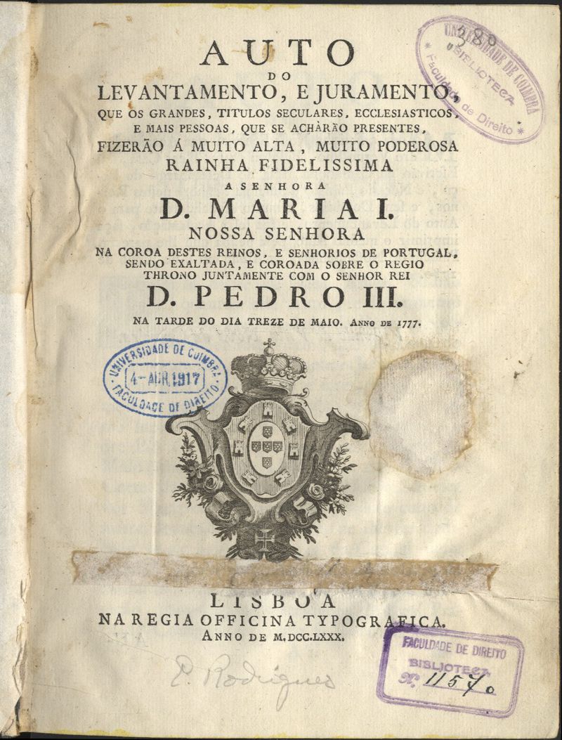 Auto do levantamento, e juramento, que os grandes, titulos seculares, ecclesiasticos e mais pessoas, que se acharäo presentes, fizeräo á muito alta, muito poderosa rainha fidelissima a senhora D. Maria I ... e coroada sobre o regio throno juntamente com o senhor rei D. Pedro III na tarde do dia treze de Maio, anno de 1777.