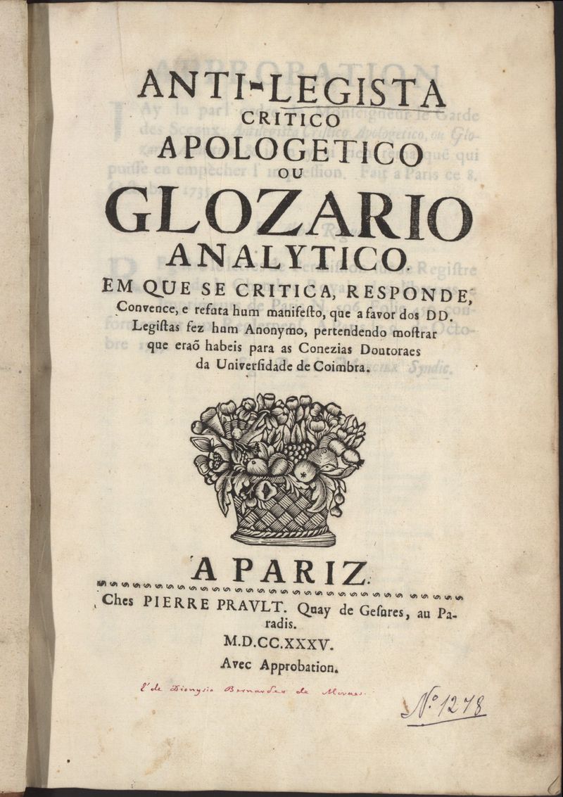 Anti-legista critico apologetico ou glozario analytico : em que se critica, responde, convence, e refuta hum manifesto, que a favor dos DD. legistas fez hum anonymo, pertendendo mostrar que eraõ habeis para as Conezias Doutoraes da Universidade de Coimb