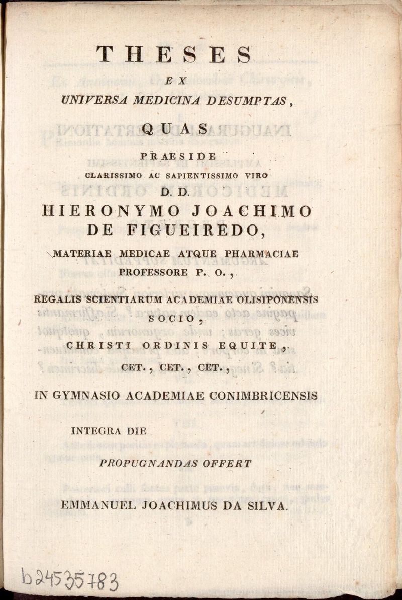 Theses ex universa medicina desumptas, quas praeside clarissimo ac sapientissimo viro D. D. Hieronymo Joachimo de Figueiredo...in gymnasio Academiae Conimbricensis...propugnandas offert Emmanuel Joachimus da Silva