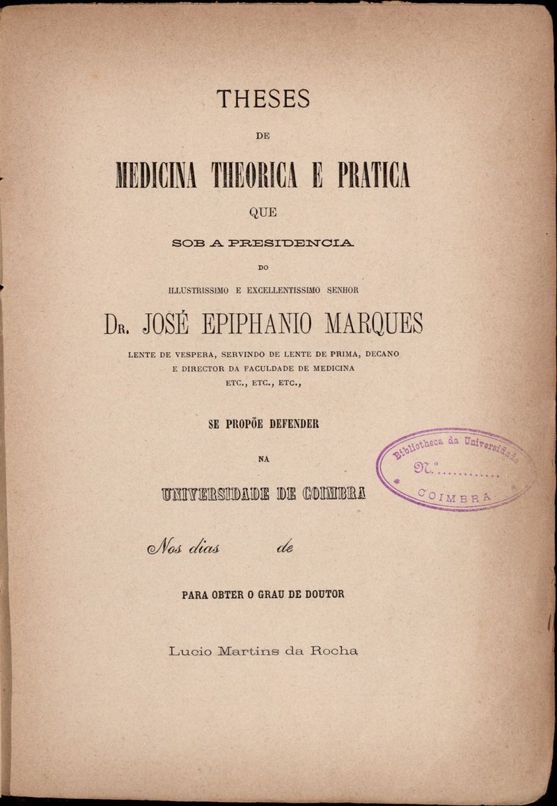Theses de medicina theorica e pratica que sob a presidencia do illustrissimo e excellentissimo senhor Dr. José Epiphanio Marques... se propõe defender na Universidade de Coimbra... Lucio Martins da Rocha