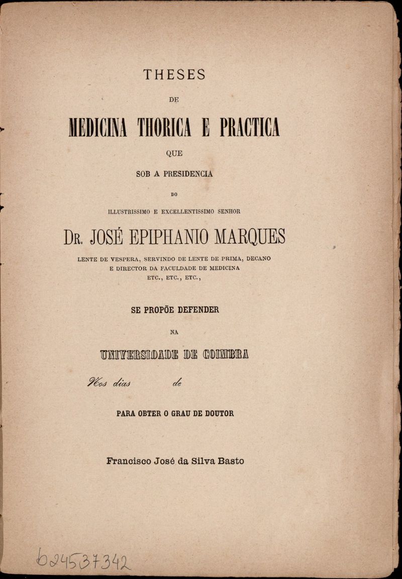 Theses de medicina thorica [i.e. theorica] e practica que sob a presidencia do illustrissimo e excellentissimo Dr. José Epiphanio Marques... se propõe defender na Universidade de Coimbra... Francisco José da Silva Basto