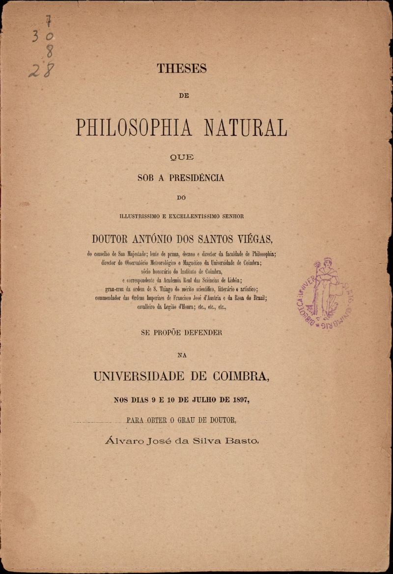 Theses de philosophia natural que sob a presidencia do illustrissimo e excelentissimo senhor Doutor António dos Santos Viégas... se propõe defender na Universidade de Coimbra nos dias 9 e 10 de Julho de 1897 para obter o grau de doutor Álvaro José da Silva Basto