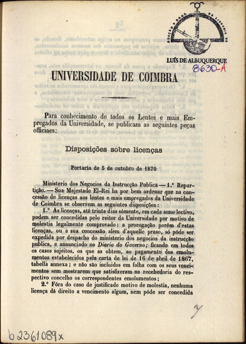 Miscelânea de legislação académica, enc. - Nota ms., do punho de Luís de Albuquerque, na f. de guarda da enc.: "Comprei este livro num leilão de 1952. Pela indicação que vai no rosto, parece que devia ter sido desviado da Univ". - Nota ms. no ros