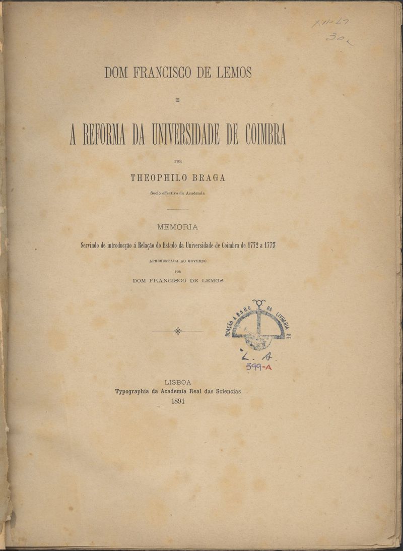 Dom Francisco de Lemos e a reforma da Universidade de Coimbra / Teophilo Braga. Relação geral do Estado da Universidade de Coimbra desde o principio da Nova Reformação até o mez de Setembro de 1777, para ser prezente á Rainha Nossa Senhora ... dada pelo Bispo de Zenopole e coadjutor e futuro successor do Bispado de Coimbra e actual Reformador e Reytor da mesma Universidade.