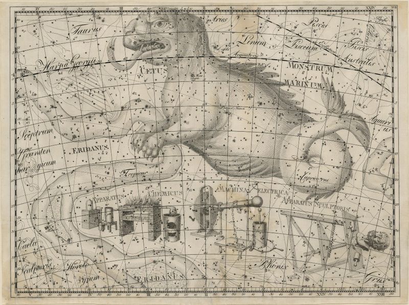 Contém estrelas de diversas constelações: Cetus seu Monstrum Marinum, Eridanus, Apparatus Sculptoris, Machina electrica, Apparatus Chemicus, identificadas em: BODE, Johann Elert - Uranographia sive astrorum descriptio. Berolini, 1801.