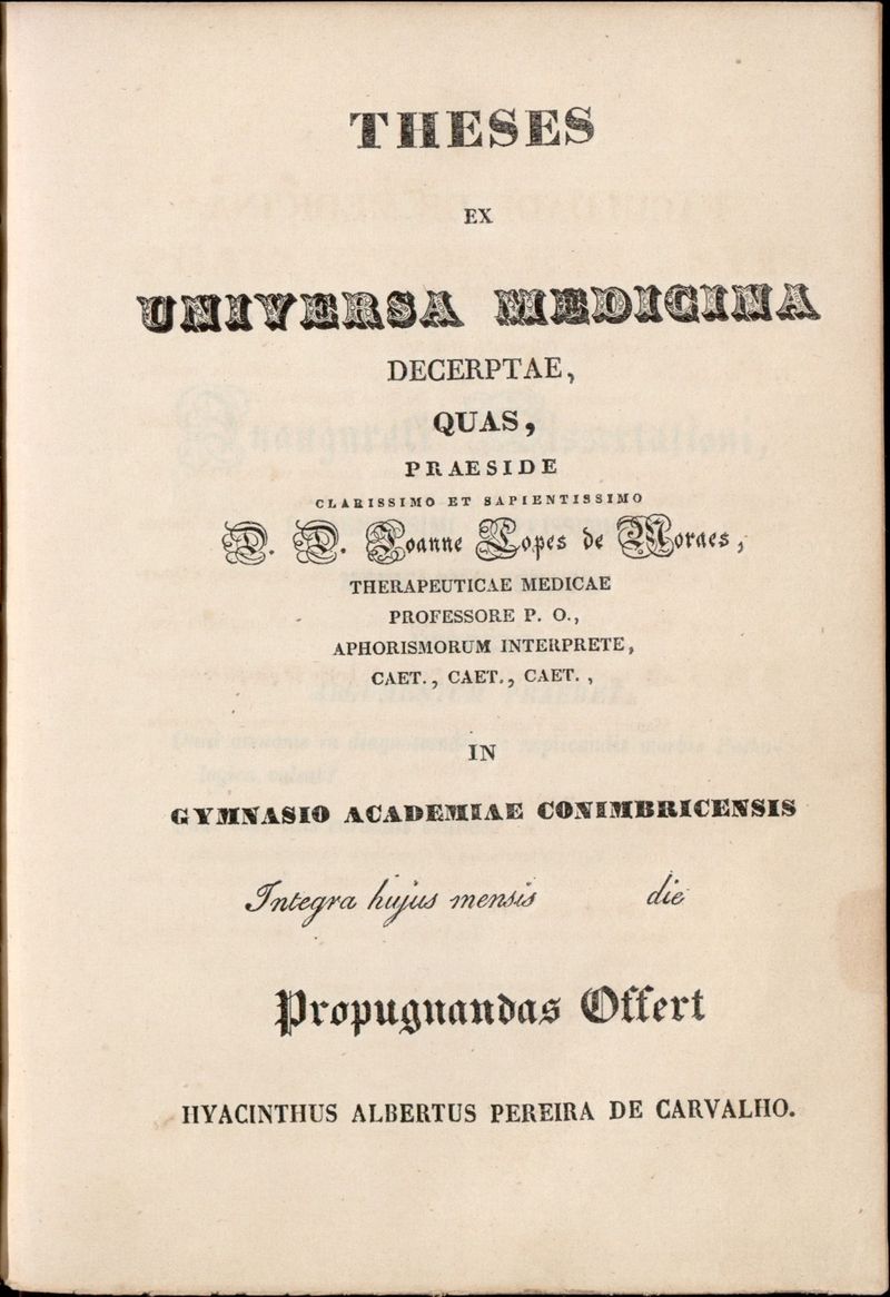 Theses ex universa medicina decerptae, quas, praeside clarissimo et sapientissimo D. D. Joannes Lopes de Moraes...in gymnasio Academiae Conimbricensis...propugnandas offert Hyacinthus Albertus Pereira de Carvalho