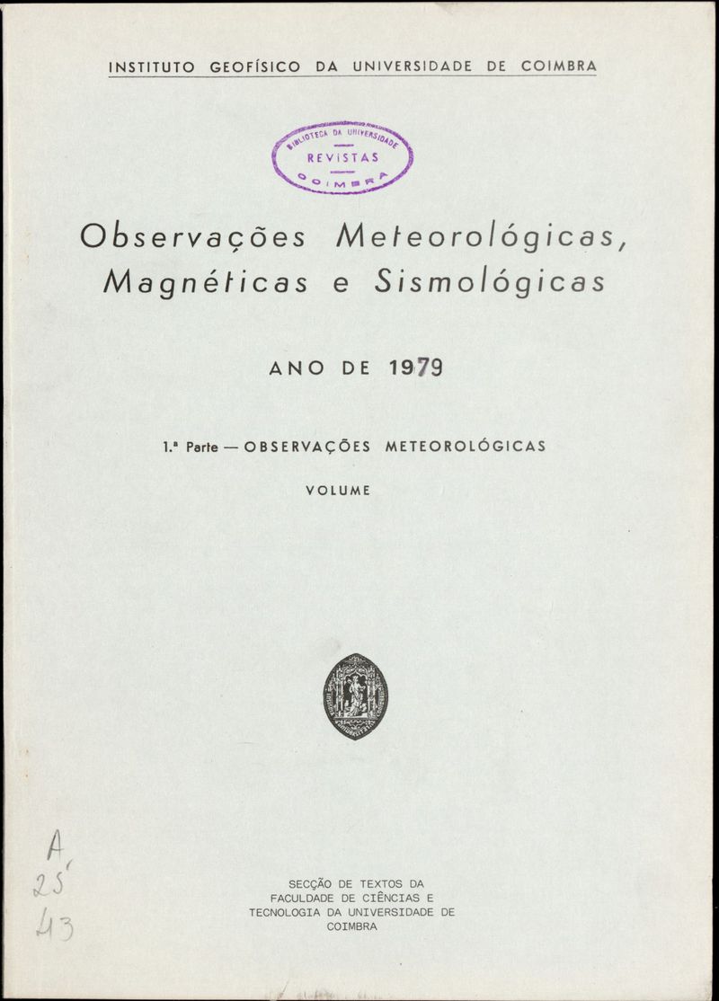 Observações meteorológicas, magnéticas e sismológicas feitas no Observatório Meteorológico e Magnético de Coimbra - 1979-1