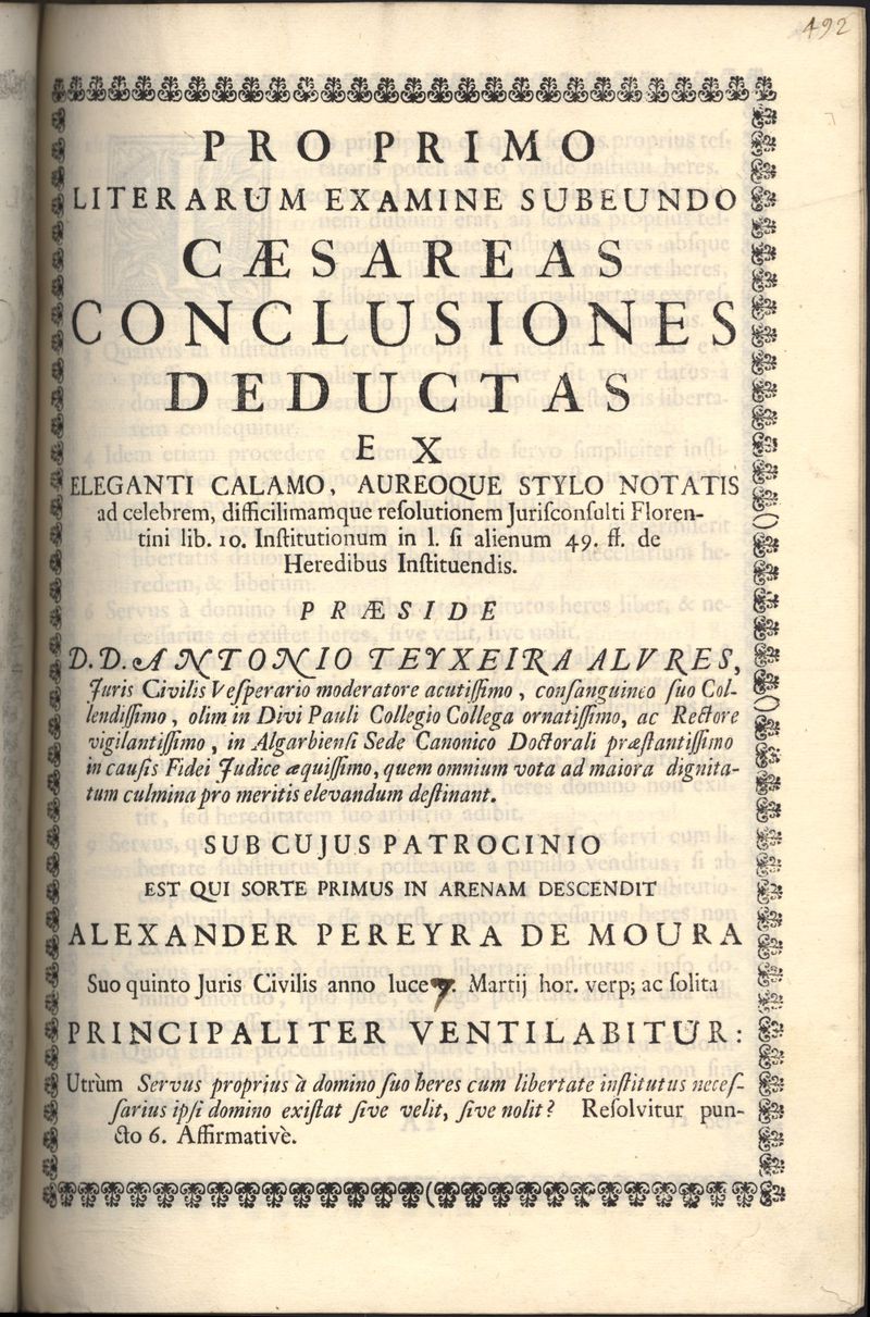Pro primo literarum examine subeundo cæsareas conclusiones deductas :ex eleganti calamo, aureoque stylo notatis ad celebrem, difficilimamque resolutionem jurisconsulti florentini lib. 10. Institutionum in l. si alienum 49 ff. de heredibus instituendis : principaliter ventilabitur : utrÆum servus proprius à domino suo heres cum libertate institutus necessarius ipsi domino existat sive velit, sive nolit? Resolvitur puncto 6. Afirmativè