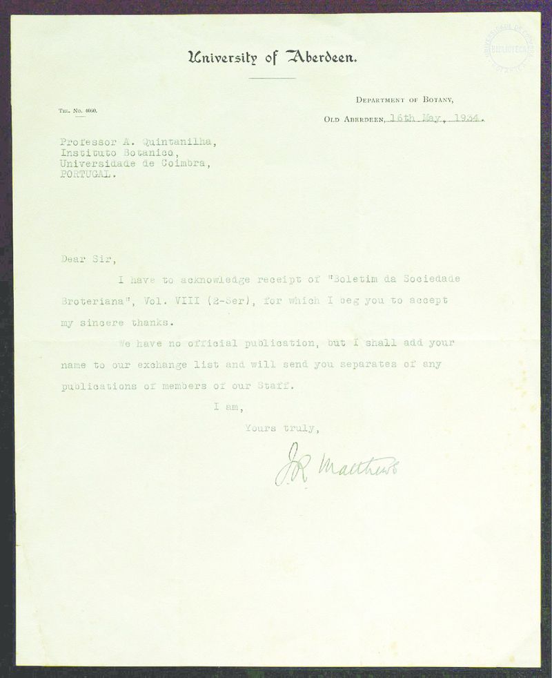 [Letter], 1934 May 16, Aberdeen, [to] Professor Dr. A. Quintanilha, Coimbra